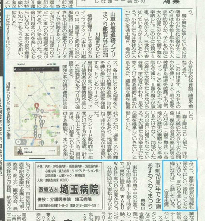 新聞にて、「川越まつりナビ」の紹介が掲載されました。
